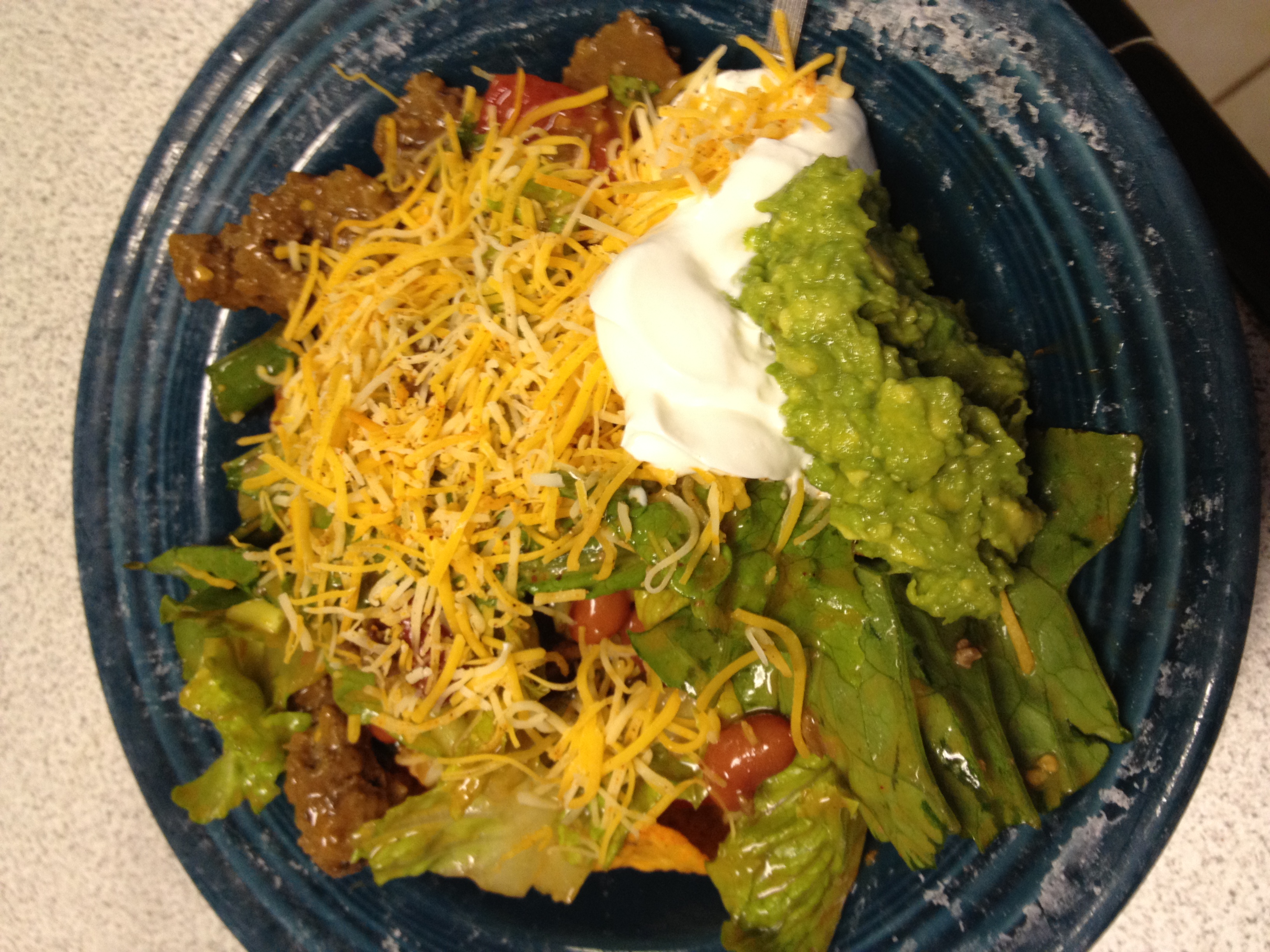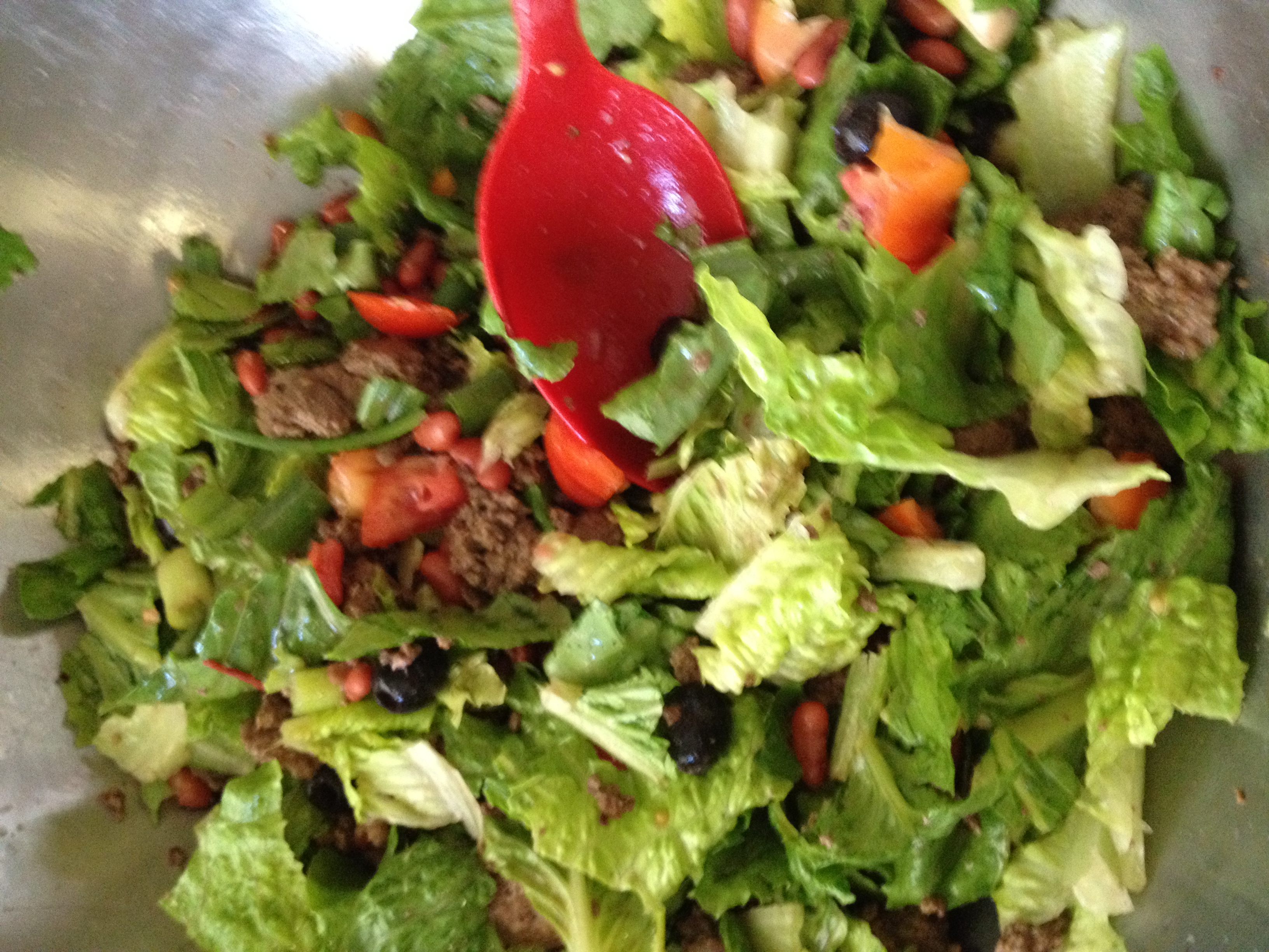 Brown your ground beef add taco seasoning – chop lettuce, tomatoes and onion combine in bowl with
